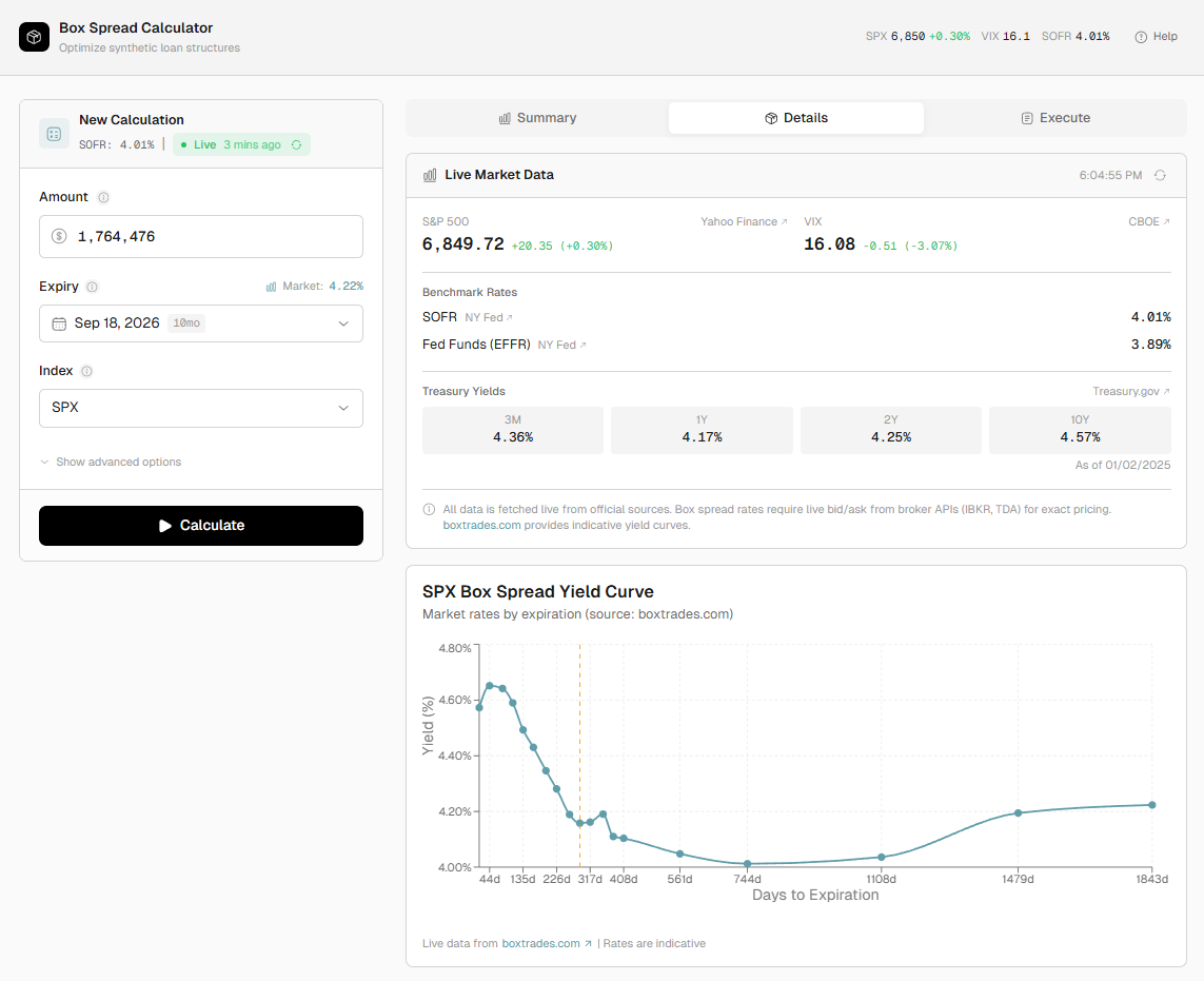 Financial tool democratizing sophisticated borrowing strategies through options arbitrage with real-time market data.